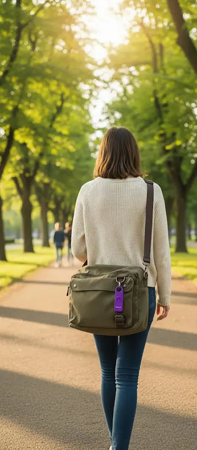 Sleek 96 × 30 × 15 mm design weighing only 55 g fits easily on keyrings, handbags, backpacks, or mobility aids. -